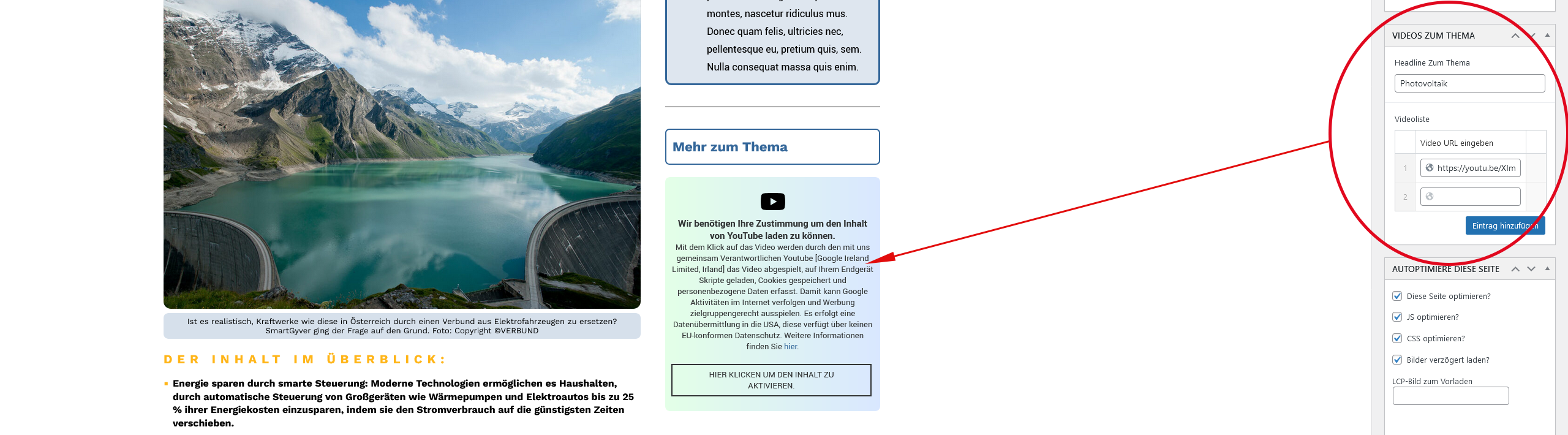 Den korrekten Link zum Einbinden kann man von den Verwaltern des YouTube-Kanals erfragt werden – die Art ist immer zB https://youtu.be/rFXwjVrxv_s – diesen dann einfach in das Feld einkopieren. Durch den blauen Button „Eintrag hinzufügen“ können ggf mehrere Videos angezeigt werden. Der DSGVO-Hinweis wird automatisch erzeugt. Die Überschrift ist frei wählbar/eingebbar.