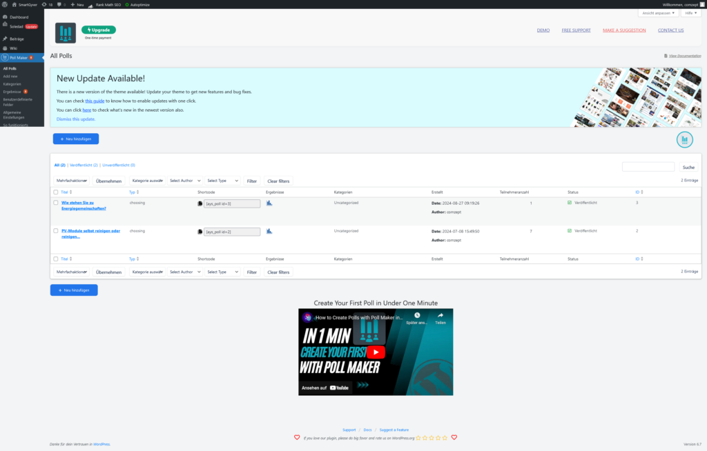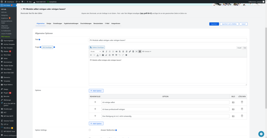 Dieses Anlegen erfolgt in einem sehr ähnlichen Interface wie die herkömmlichen Beiträge. Ist eine Umfrage fertiggestellt, kann diese mittels des sogen. Shortcodes (siehe Spalte Shortcode)